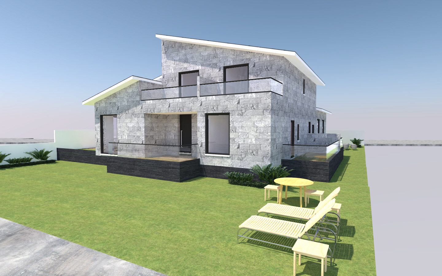 Se plantea un vestíbulo de entrada cerrado para evitar que la vivienda tenga pérdidas térmicas y corrientes al entrar y al salir, con un armario/cuarto de servicio en la entrada para abrigos, paraguas, zapatos… La entrada aparece separada del salón por una partición que será acristalada en su parte superior pero opaca en la inferior para dar privacidad a la zona de estancia desde la entrada. La fachada lateral de la entrada se plantea con una cristalera al porche.
