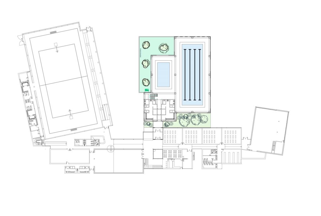 El proyecto busca integrarse con el polideportivo existente situando la piscina cubierta cercana al gimnasio. Así se mantienen las instalaciones deportivas de actividad individual centralizadas. Se ha cambiado la entrada de acceso al polideportivo moviendo el mostrador de control para dar mejor servicio y funcionalidad al conjunto del edificio.