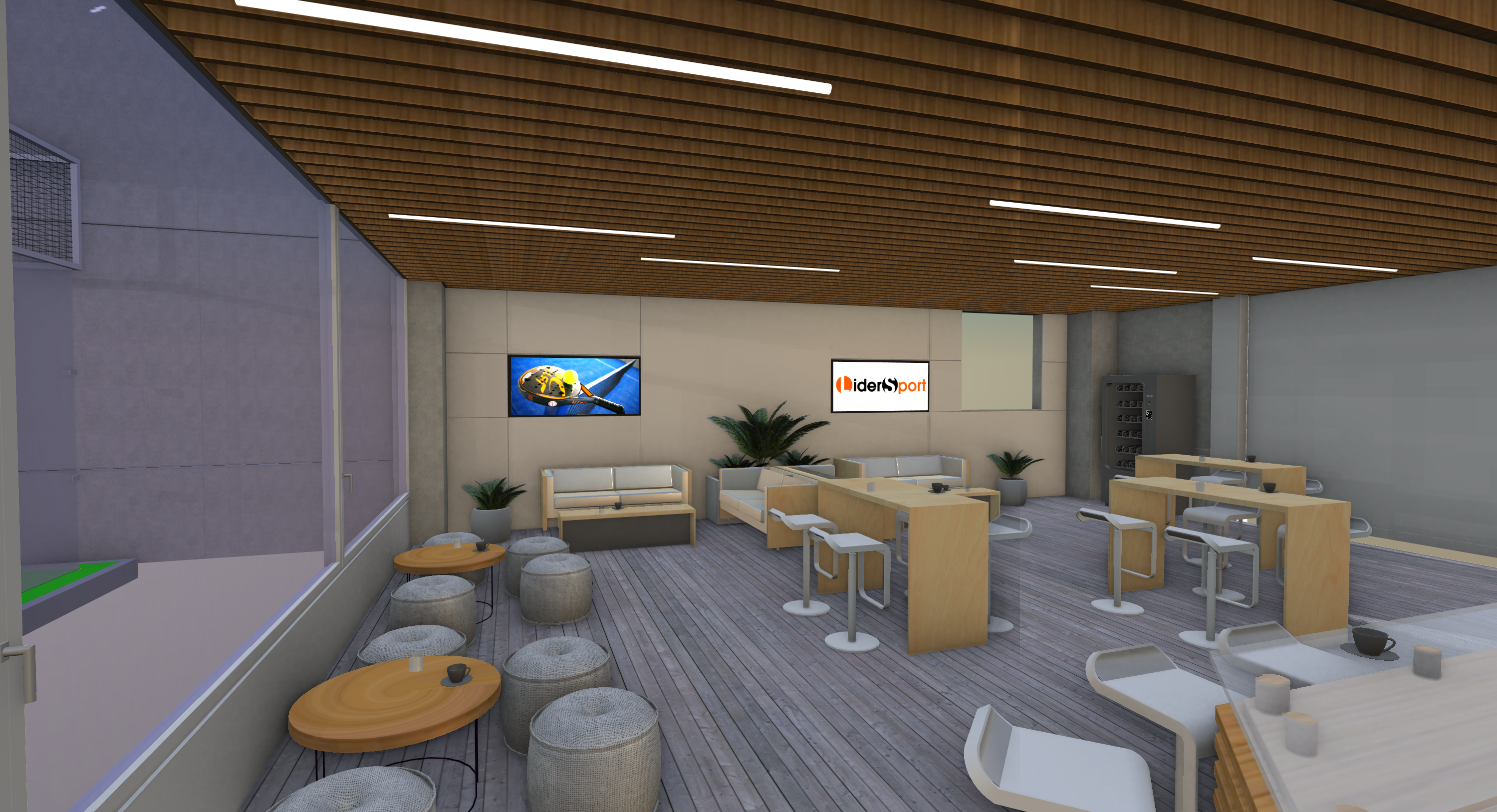 Las pistas de pádel Indoor se plantean en una nave industrial ya construida se plantea la dotación de uso deportivo con la construcción de 5 pistas, una pista de crossfit y una zona de control que se usaría también como cafetería. Se disponen unos vestuarios en la planta superior y un baño accesible en la planta inferior.