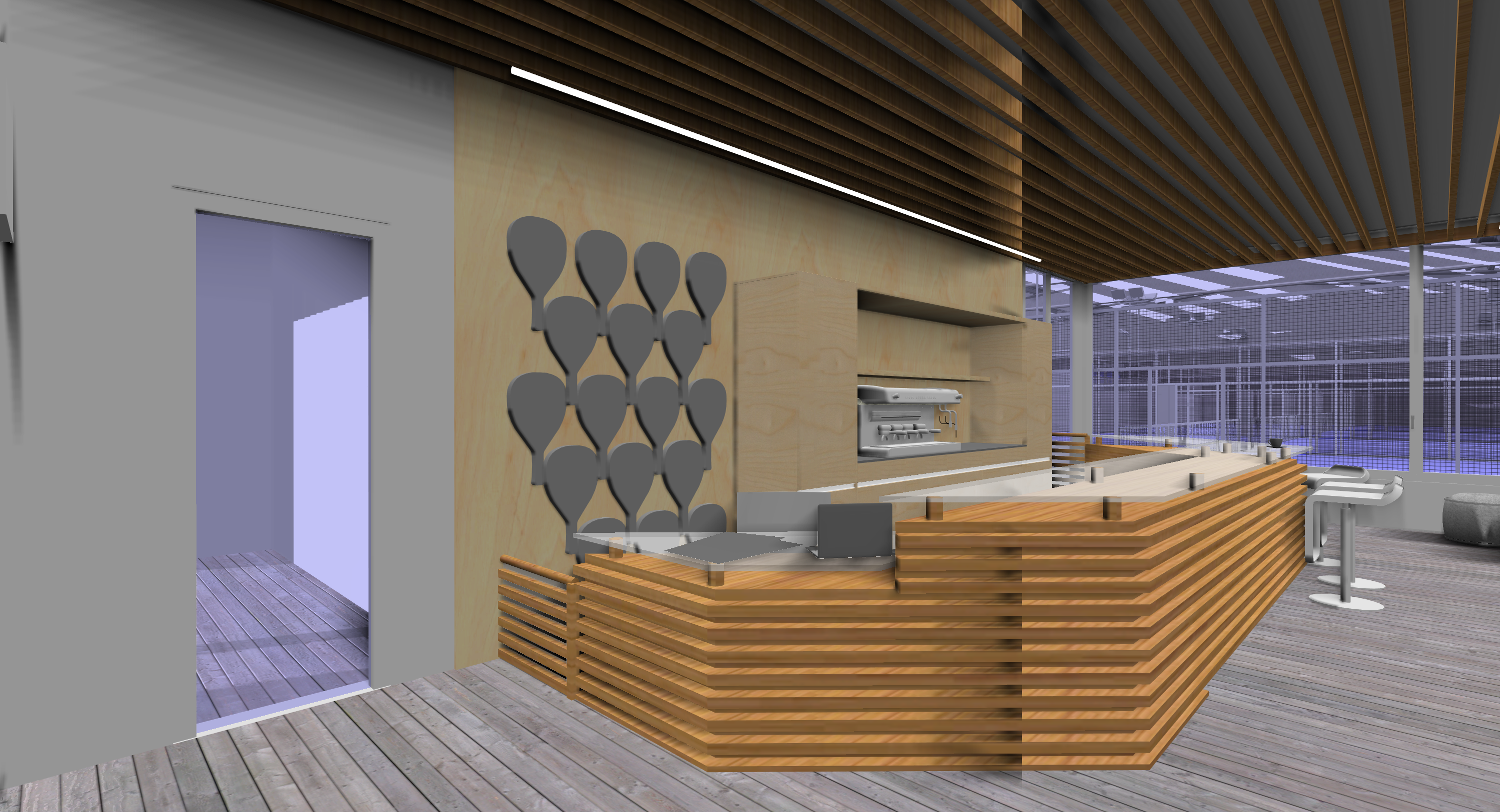 El mostrador de la zona de control se diseña pensando que la persona responsable se hará cargo de la recepción a la vez que la cafetería, por lo que se plantea una mostrador con dos alturas, la más alta para la cafetería y otra zona a nivel de mesa para poder realizar las labores de recepción y secretaría.