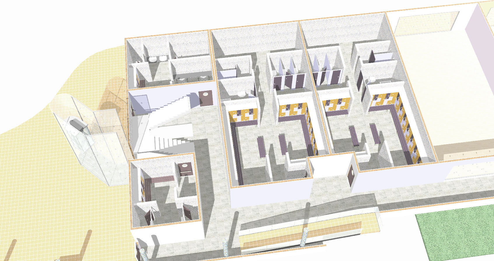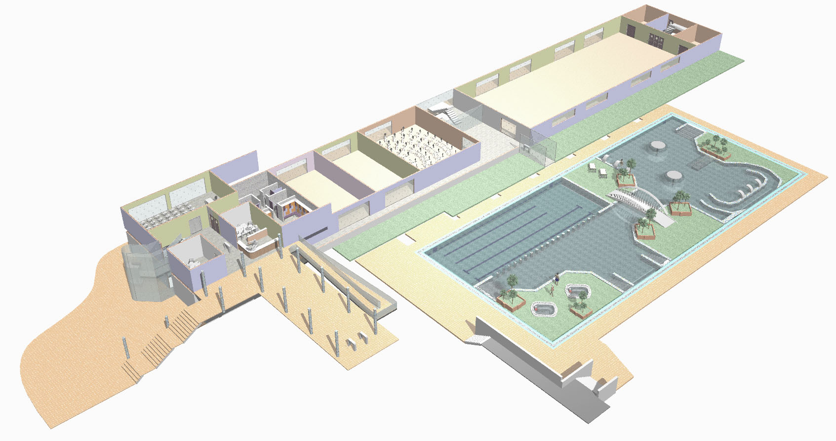 El enunciado del proyecto planteaba la conversión de la casa del deporte y el reacondicionamiento de la piscina olímpica existente para convertirlo parcialmente en un vaso deportiva de 25m x12m y recreativa y spa en la superficie restante.